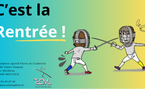 Après ces deux mois de pause estivale, nous sommes heureux de vous annoncer la reprise des activités de l’Escrime Club Mouvallois à partir du lundi 8 septembre 2025 selon le calendrier suivant : Vous avez été, ou serez, destinataire d’un courrier et d’un mail pour vous préciser toutes les modalités […]