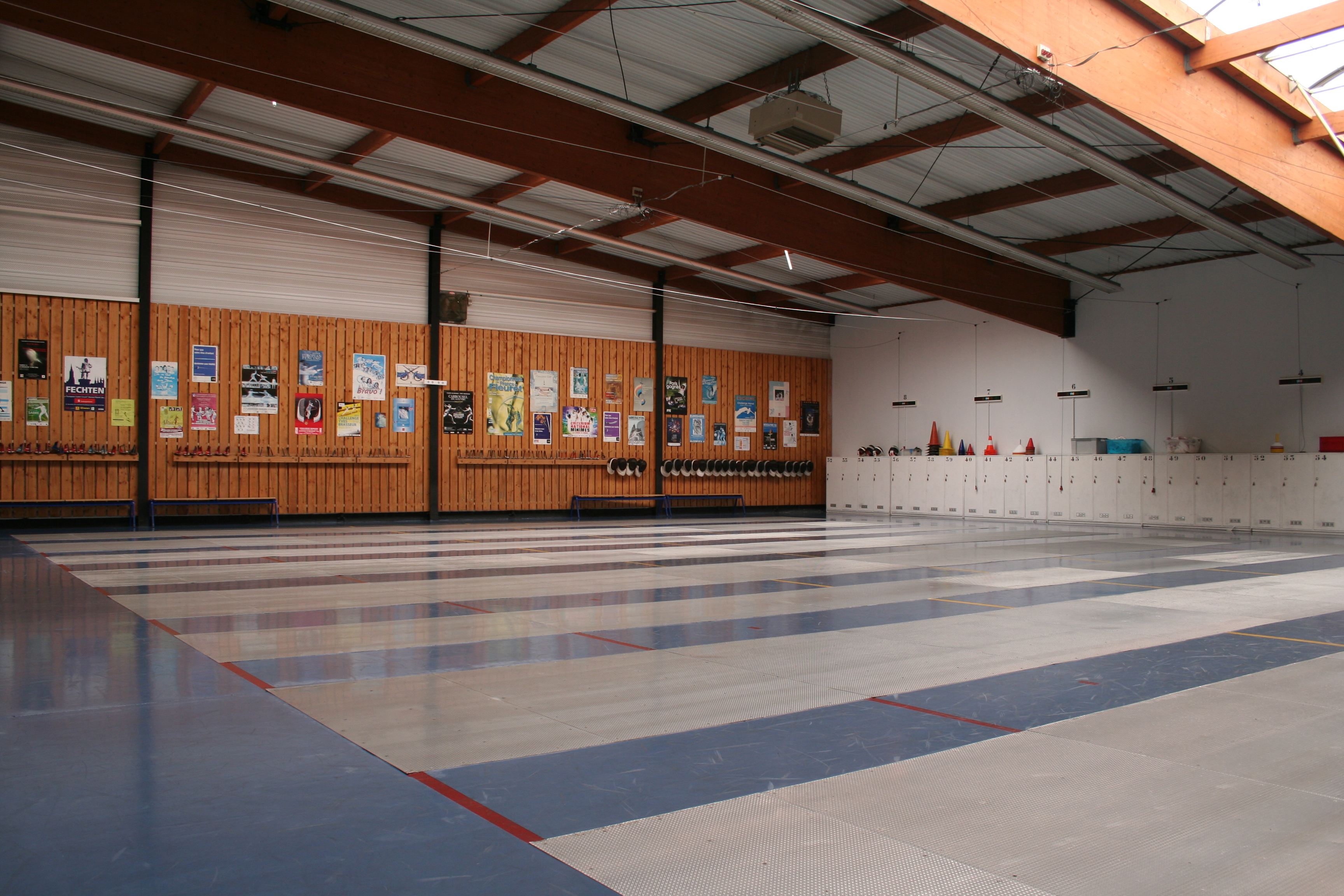 La salle dispose de 8 pistes électriques aux 3 armes, de vestiaires, de douches et d’armoires individuelles.